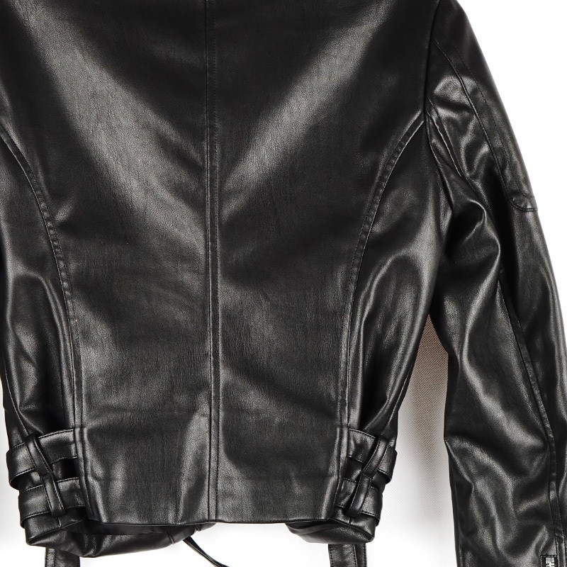 Description: black biker jacket, casual biker style, cropped moto jacket, edgy cropped jacket, elegant black coat, vegan fashion coat, vegan leather jacket, winter transition piece, women's belted jacket, zipper front outerwear