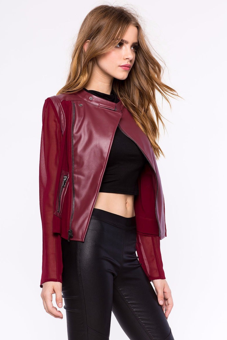 Description: black vegan jacket, burgundy leather coat, chiffon sleeve jacket, cropped jacket, elegant transition jacket, flowy chiffon details, vegan fashion piece, vegan leather jacket, women's short coat, zipper front outerwear