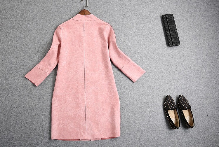 Description: chic suede coat, contrast leather jacket, long suede coat, pink long jacket, pink suede jacket, suede contrast detail, suede jacket, trendy suede jacket, winter suede coat, women's suede outerwear