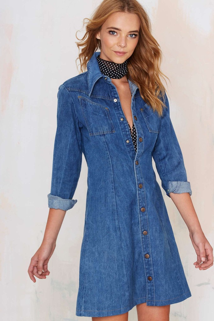 Description: asymmetric pocket denim dress, blue denim mini dress, casual denim dress spring, cotton polyester denim mini, everyday mini denim dress, long sleeve denim mini dress, mini denim dress women, retro buttoned mini denim dress, retro metal button dress, wide leg denim dress alternative