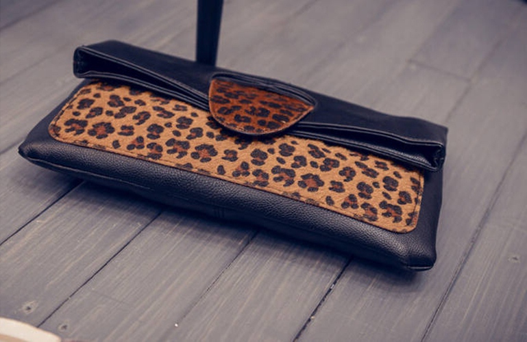 Description: black leopard bag, chain clutch, evening clutch, faux leather clutch, gold chain bag, leopard print bag, mini clutch, statement clutch, wild print bag, women's clutch