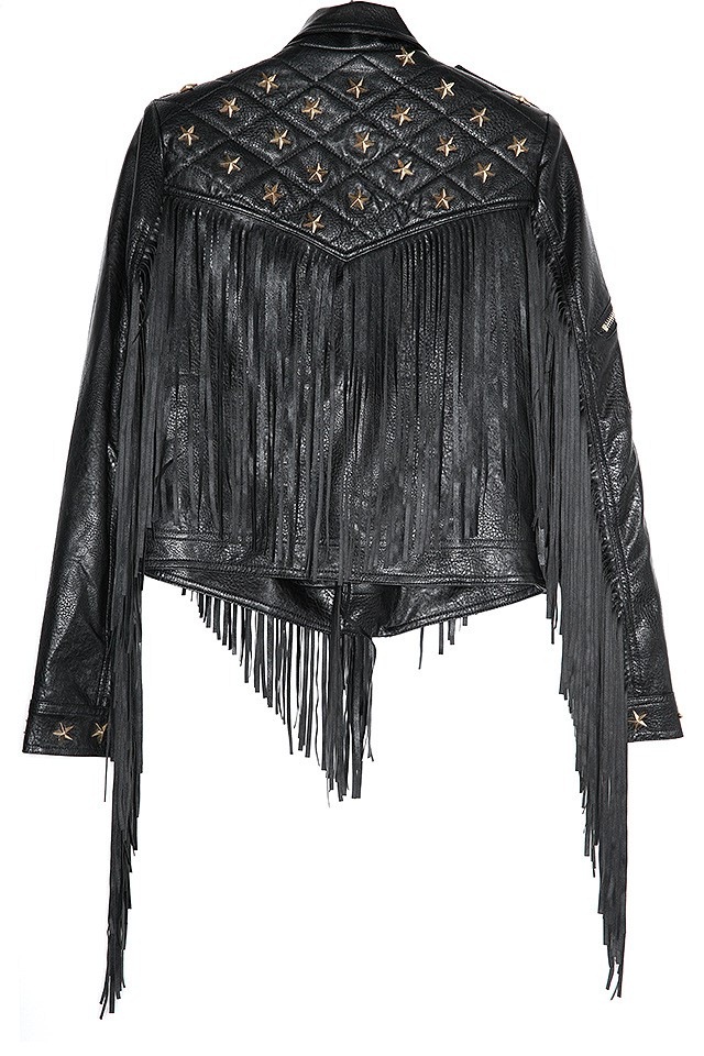 Description: black biker jacket, cropped leather jacket, edgy jacket, faux leather jacket, fringe jacket, party leather jacket, rebellious jacket, star detail jacket, studded leather jacket, women's leather jacket