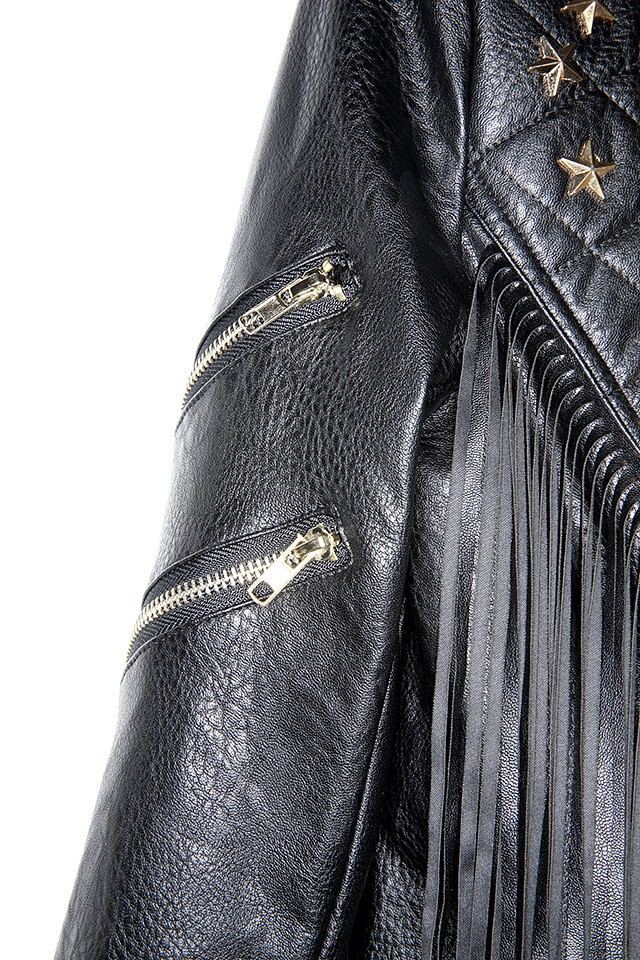 Description: black biker jacket, cropped leather jacket, edgy jacket, faux leather jacket, fringe jacket, party leather jacket, rebellious jacket, star detail jacket, studded leather jacket, women's leather jacket