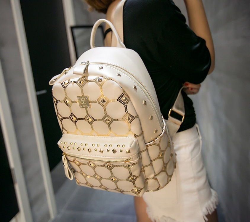 Description: beige backpack, black backpack, chic studded purse, gold backpack, plaid backpack, purple backpack, rock style backpack, studded backpack, synthetic leather backpack, unisex studded bag