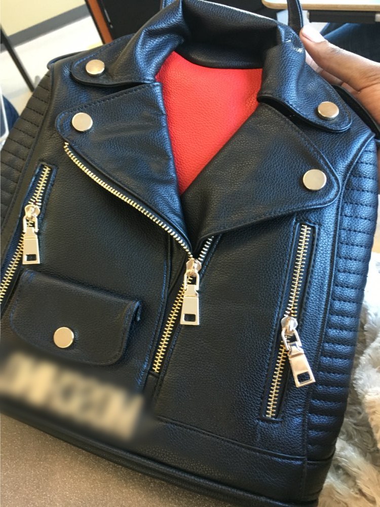 Description: black backpack, chic backpack, innovative accessory bag, jacket design backpack, metal zipper backpack, street style backpack, synthetic leather backpack, unique design bag, unisex backpack, vintage backpack