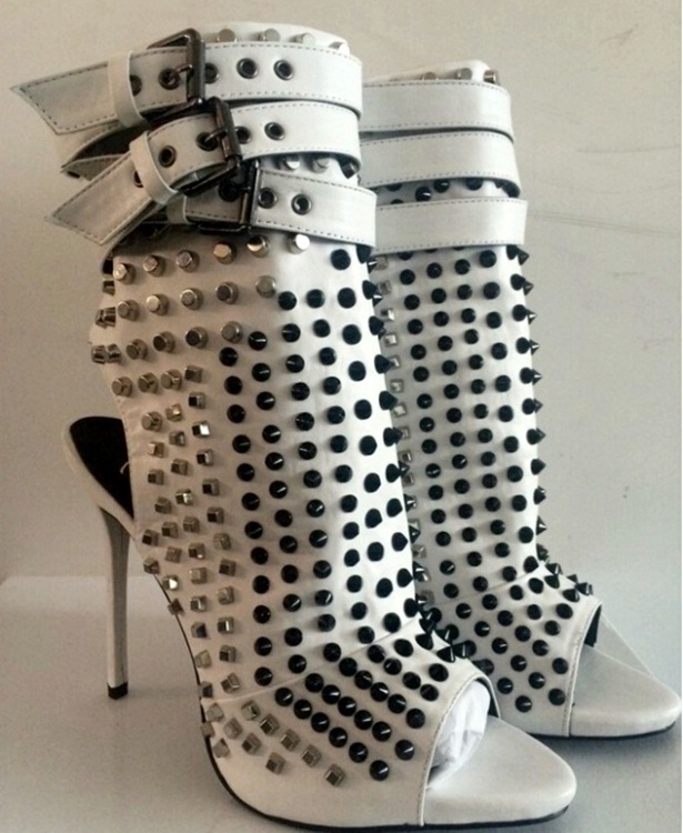 Description: 10 cm heel sandals, ankle strap sandals, black high heel sandals, bold sandals, edgy high heels, genuine leather sandals, metal stud sandals, pointed toe sandals, studded high heel sandals, white high heel sandals