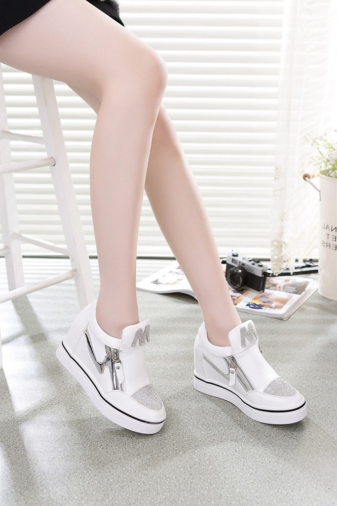 Description: 4 cm hidden heel sneakers, black crystal sneakers, comfortable crystal embellished shoes, crystal hidden heel sneakers, elegant daily sneakers, genuine leather crystal sneakers, metal zipper sneakers, sparkling crystal sneakers, versatile hidden heel sneakers, white hidden heel shoes