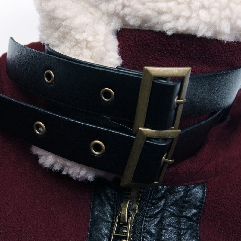 Description: belted cuff details, bordeaux leather outerwear, cropped suede coat, elegant plush accents, faux fur lined jacket, genuine suede fashion, luxury casual wear, plush trimmed coat, suede jacket, women's winter jacket