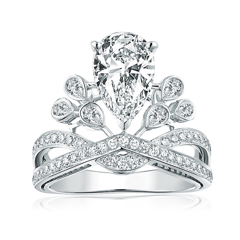 Description: elegant silver ring, luxury crown motif ring, pave stone ring, pear cut sapphire jewelry, sapphire crown ring, silver crown design ring, sparkling white sapphire ring, timeless sapphire jewelry, unisex sapphire ring, white sapphire ring