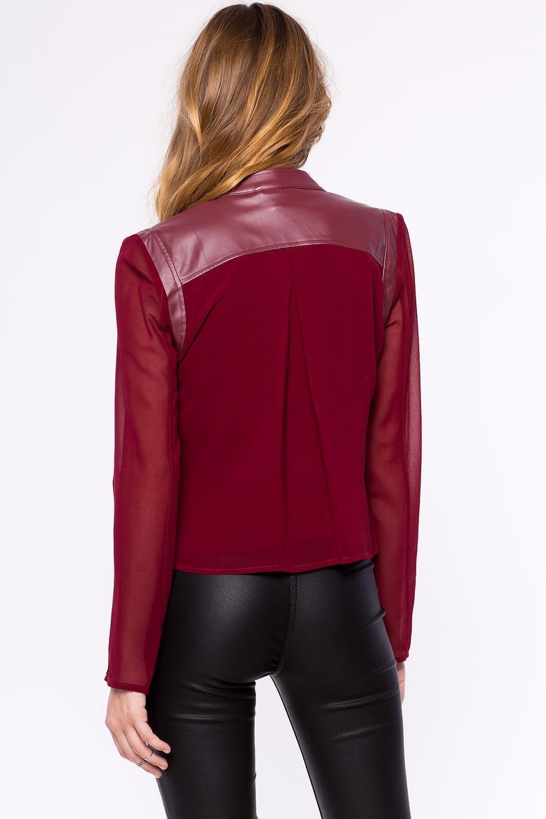 Description: black vegan jacket, burgundy leather coat, chiffon sleeve jacket, cropped jacket, elegant transition jacket, flowy chiffon details, vegan fashion piece, vegan leather jacket, women's short coat, zipper front outerwear
