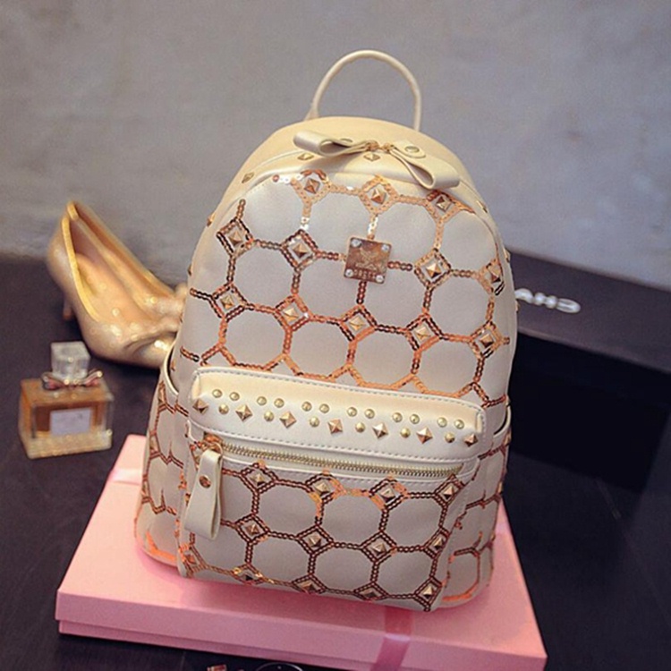 Beige Color Studded Rivet Leather Backpack Rucksack