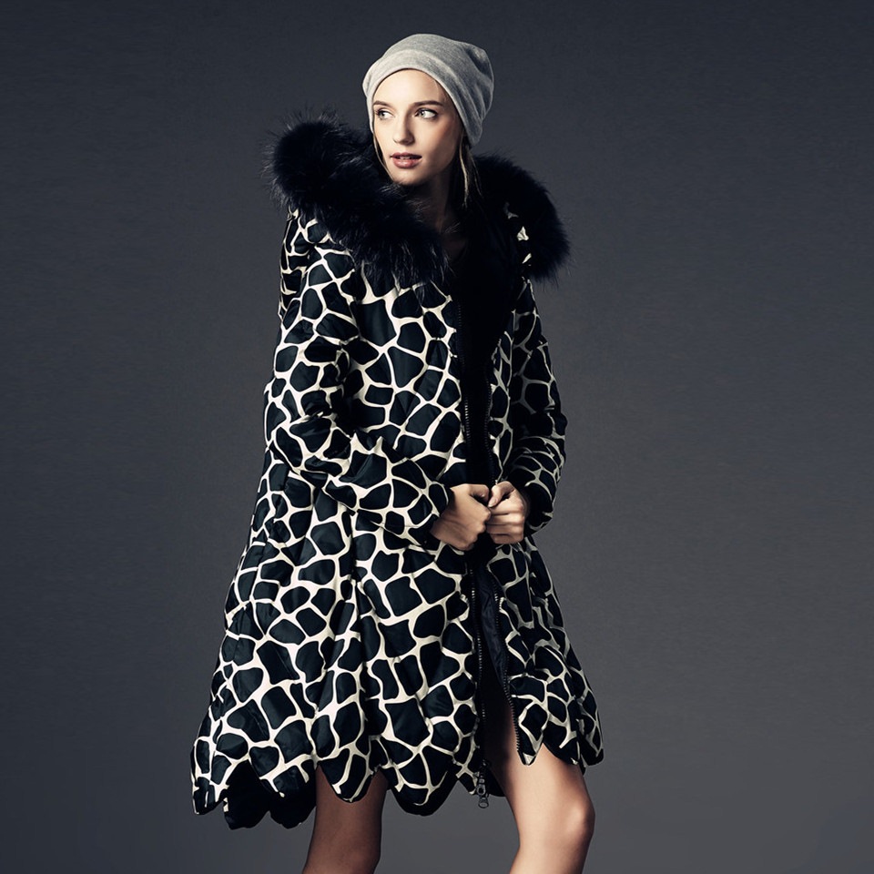 Description: animal print jacket, bold fashion outerwear, cozy parka jacket, down filled coat, fur trimmed parka, giraffe pattern parka, hooded fur parka, oversized winter coat, winter parka women, zebra print parka